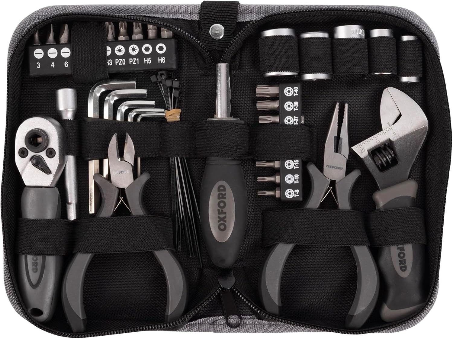 Soft gel handles ensure the tools are comfortable to use and each is kept in its place by a snug fitting elasticated strap inside a compact storage case, ideal to keep under your rear seat . The sockets, extension bar hex and torx keys are made from durable chrome vanadium steel.